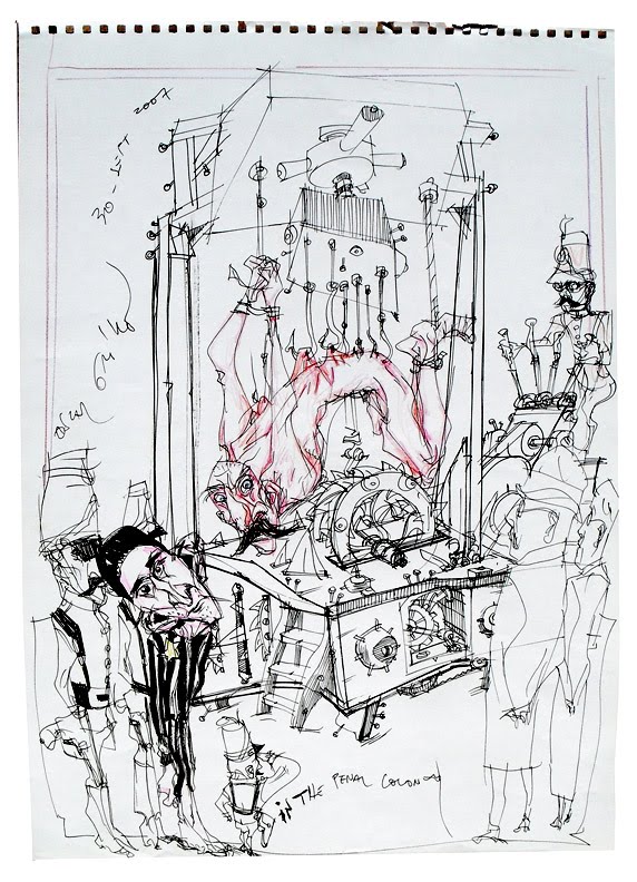 It is precisely in this inscription that is outside any formal judiciary framework and located in the interstices of the law that is written in books and manuscripts of liberal institutions. Escaping the rational prescription of language, this inscribed law is located in a sphere outside the liberal framework of rationality. In torturous practices, the body ‘learns’ this law through direct inscription into its flesh, like Kafka’s prisoner in the penal colony who is neither aware of his charge nor the rational of his punishment. He learns of the severity of his charge through the caption that is gradually engraved into his body by a complex, rational machinery. In Kafka’s fable, the Officer explains: “Our sentence does not sound severe. The law which a condemned man has violated is inscribed on his body with the Harrow. This Condemned Man, for example,” and the Officer points to the man affixed to the machinery, “will have inscribed into this body, ‘Honour your superiors'”.