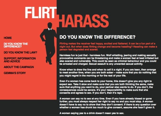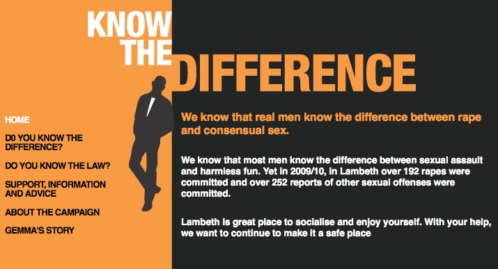 There’s something about this all which is faintly infantalising, like an NGO-version of Jermaine Stewart (we don’t have to take our clothes off to have a good time!), or even the right-wing fantasy of a nannying state, in loco parentis and explaining to young thugs how to woo the ladies. In the ‘Know The Difference’ campaign at least, softly persuasive information about women’s feelings is combined with the threat of the stick of law (you could go to jail, boyo), although unsurprisingly without any information on how ridiculously low conviction rates are.
