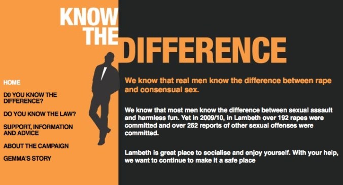 Likewise Lewisham’s ‘Know The Difference’ campaign posters, which overflow with references to what ‘real’ men do and think and how you can ‘have fun’ without engaging in sexually-aggravated assault. Note how both sets of ads also engage with common myths about rape. In speaking ‘to’ potential rapists, they feel compelled to begin from the standard trope that the line between rape and consensual sex can be confusing. Their focus is on dates which don’t lead to sexual satisfaction, not on random assaults on the street or systematic abuse by authority figures. As lines of communication between the men featured and the men being addressed, they say “hey, I know how it can be”.