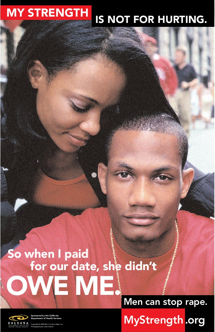The crucial thing, I think, is the way in which the appeal to genuine masculinity is made. On one reading, rape is removed from the menu of acceptable male behaviour while preserving or promoting a range of other patriarchal attitudes, in particular the idea of men as decision-makers, material providers and romantic pursuers, the active agents in the drama of love. This means a campaign of persuasion which half-chastises men but still in the name of a kind of phallic power, that essential male strength which is taken to be greatest exactly at the point in which men restrain themselves (I am more than capable of hurting, but I choose not to). To me, this is the voice of the father, the male authority figure who sets limits, teaches control and disciplines the capacity for violence.