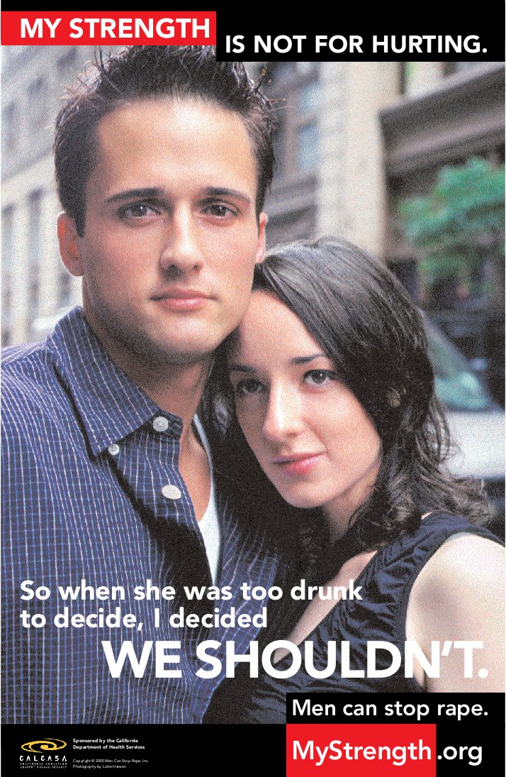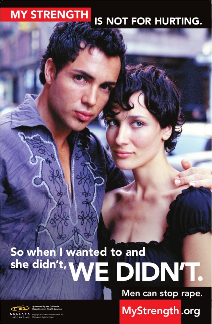 Given this kind of association between masculinism and rape propensity, it seems natural that anti-rape advertising would position itself in a way that appeals to the men most likely to rape, which is to say the most traditionally patriarchal ones. Indeed, that should be our demand for effective intervention. So while some target the common tropes used to justify sexualised assault, as in this Not Ever campaign video, the more general trend appears to be to appeal to those patriarchal norms that are nominally opposed to rape. Classically conservative, these are the ideas of men as honourable, protective, gentlemanly (but not necessarily gentle), protective, faithful, often monogamous, and so on. This is best illustrated by the Californian ‘My Strength’ campaign, which is pretty explicitly about men not raping because they’re men and because that’s not what strong, cool guys do, yeah?