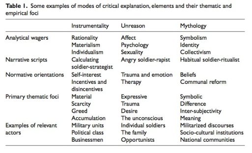 Turning to a substantive analysis of different explanations of war rape, three explanatory modes are revealed. Existing accounts of rape as a weapon of war have privileged instrumentality, unreason or mythology as modes of wartime sexual violence. Each mode carries its own analytical style in its elements, articulated through a focus on particular empirical regularities and a corresponding characterisation of instances of sexual violence. All have a plausibility when dealing with particular examples. However, the shifting nature of both the modes and of the phenomena under analysis resists any easy preference for one mode over others or reduction of them to three separate and wholly incommensurate hypotheses of sexual violence. The modes are coherent but not in the sense of being directly competing paradigms. They are partly overlapping, and ambiguous at the margins, but also apparently contradictory on a range of key analytical problems.