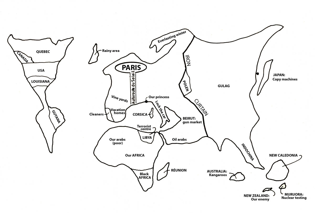 [5] To go back to the point about what Kant means to International Theory, one could argue that Kojève’s humanism is paternalist and racialized (as captured by the 1989 “Parisian map of the world” above), but still a step in the emancipatory direction of, say, Césaire’s or even Fanon’s humanism (cf. Ethan Kleinberg, “Kojève and Fanon: The Fact of Blackness and the Desire for Recognition” in Tyler Stovall and George Van Den Abbeele, eds., French Civilization and Its Discontents [Lexington, 2003]).