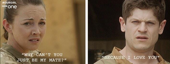 While Molly’s essentialised femininity in relation to her friendship with Bashira and her symbolisation of the apparent modernity of the British military could be seen as a positive, however, the love triangle which emerges between Molly, Captain James, and Smurf is a textbook illustration of one of the classic arguments against women’s presence in front-line military units. While Molly’s feelings for Smurf never progress beyond close friendship, Smurf declares his love for her, promising her a trip to Las Vegas and even giving her his mother’s engagement ring, “no strings attached,” hoping perhaps that when the two are no longer on active service in the same platoon (and therefore not permitted to be romantically involved by army regulations) their relationship can develop. With Captain James, on the other hand, it is Molly who pursues the relationship, choosing a moment of particular danger as the two carefully approach a possibly booby trapped body to ask, “do you love me?”, prompting one Twitter user to comment,