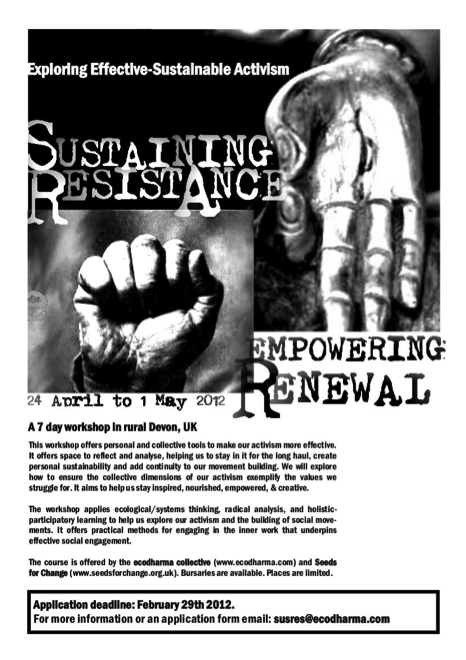 A guest post in our resilience and solidarity symposium from Rhys Kelly and Ute Kelly. Rhys is a Lecturer in Conflict Resolution at the Division of Peace Studies, University of Bradford. His work currently focuses on the pressing challenges posed by ecological crises (including climate change) and resource depletion (including ‘peak oil’). Retaining a long-standing interest in (peace) education, Rhys’ work is now broadly concerned with investigating what kinds of individual and social learning are needed and possible in the context of increasing global insecurity, which might support just and peaceful transitions to more resilient, ‘sustainable’ communities. Ute is a Lecturer in Peace Studies at the University of Bradford. Her current research interests arise from the intersection of two areas that she has been interested in – the theory and practice of participatory engagement processes (particularly dialogue and deliberation), and the emerging interdisciplinary field of social-ecological resilience. Ute is interested in exploring the communicative and collaborative dimensions of resilience, the relationships between people and the places in which they find themselves, and approaches to enhancing resilience at different levels and in a range of contexts. She also teaches a module on ‘Peace, Ecology and Resilience’ within the BA in Peace Studies, encouraging students to explore the meanings, uses and limitations of ‘resilience’. Rhys and Ute are jointly engaged in exploring the meanings of ‘resilience’ on the ground, particularly for people who have been trying to engage with the converging ecological, economic and energy crises facing us today. Relevant recent joint publications include ‘An Education in Homecoming: Peace Education as the pursuit of Appropriate Knowledge’, Journal of Peace Education (2013); and ‘Towards Peaceful Adaptation? Reflections on the purpose, scope, and practice of peace studies in the 21st Century’, Peace Studies Journal (2013).