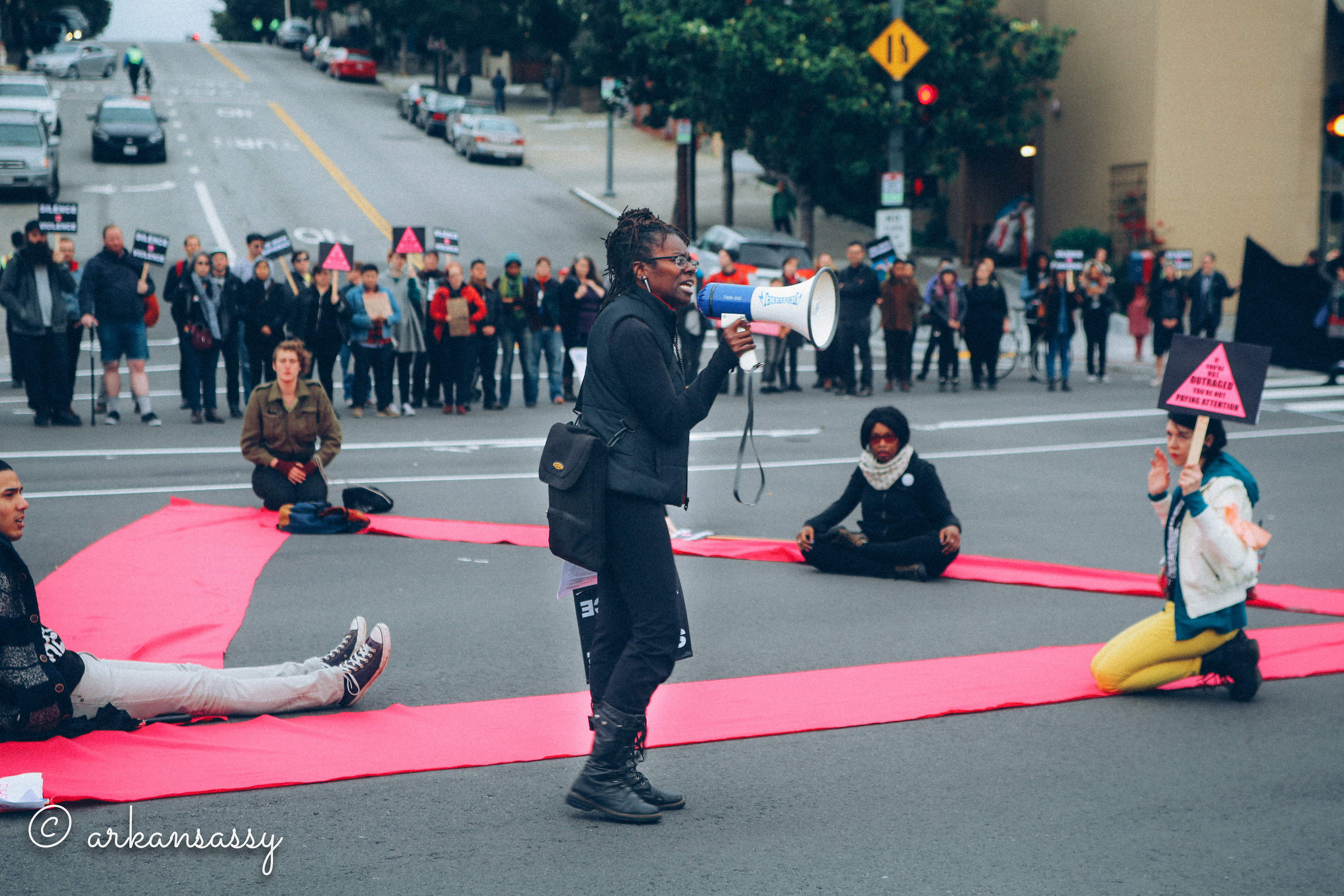 At 8.30am that morning of Christmas Eve, I had taken her to a small but determined group of protestors in front of San Francisco’s LGBT Community Centre. The protest was publicised on facebook as ‘Queers Come Out for #BlackLivesMatter’. After listening to a few speakers, the group gathered on the road to block the intersection of Market Street and Octavia Boulevard. This is the entrance to Highway 101, one of the city’s major arteries.
