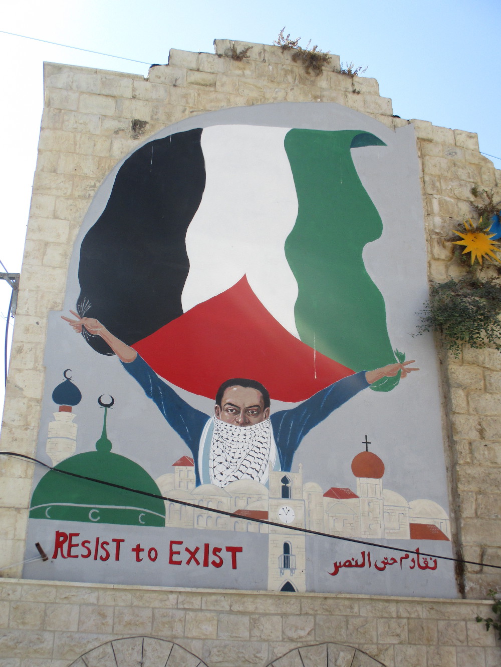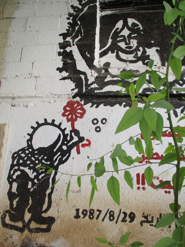 In Bethlehem we visit the UNRWA refugee ‘camps’ of Dheisheh and Aida – with the scare quotes here intended to disturb the implied temporalities of the camp. These are established places, places of intergenerational permanence for Palestinians, many of whom are born and die as ‘refugees’ with no right of return. But these are also sites of organic organisation, of community support and protest. From the ‘camp’ unfolds a distinct form of immanent politics, through which committees build alignments across political divides and under the common and unifying conditions of abjection. Camp walls are adorned with staggering murals, communicating and interpreting the colonial condition. The emblematic figure of Handala – named after the bitter plant al-handal, signifying the bitterness of the Palestinian experience – appears alongside the women who always accompany him to signify their position in “the thick of the struggle”.[10]