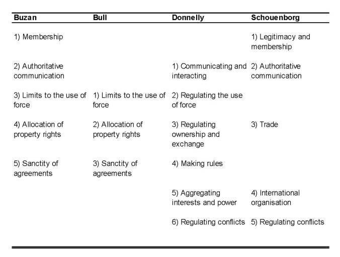 My hunch was that a set of functional categories for institutions, rightly conceived, could act as such neutral benchmarks, and I eventually came up with a list that challenged Buzan’s and Donnelly’s similar attempts in certain respects (Bull was also ascribed a list by Buzan based on his fundamental goals pursued by all societies. It features in the table below). This was the piece published in International Relations.