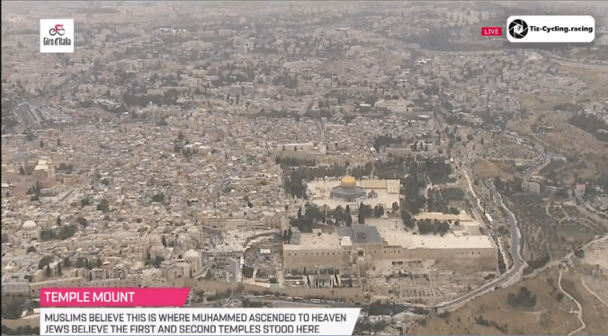 The integration of monuments, memories and histories into a coherent space is even more surreptitious for the fact that it happens off the side of the track, away from the action, but, importantly, still within the visual frame. The course is not just a track, even when it is officially bounded – it always remains a road; a part of the city and of territory. And, moreover, even whilst the racers and the commentators attempt to maintain focus on the event at hand, the vertical gaze has a tendency to stray and roam. Thus, 4 minutes and 41 seconds into Eurosport’s coverage of the 1st stage time trial, the host broadcaster’s shot is taken up by the helicopter, which holds focus on the golden dome of Temple Mount – or what Muslims know as Haram esh-Sharif – for almost a minute (see Figure 2). Despite the words of the commentator Rob Hatch, speaking to the images – “…as we get our first views from the air of the West side of Jerusalem” – what the viewer is looking at is of course the Old City, beyond the line of control, and beyond the bounds of the race itself (see Figures 3 & 4).