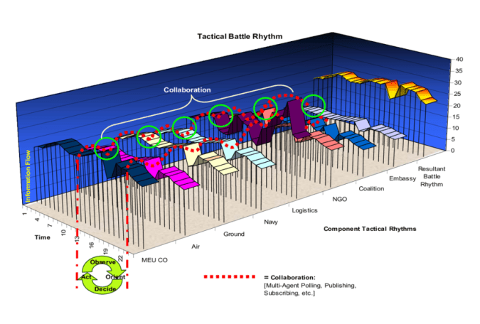 Corresponding to the remits of the operational environment, the ‘battle rhythm’ is the ‘combination of procedures, processes, and actions which facilitates extended continuous operations’. It is synchronised zulu-time: a coordinated 24 hour universal clock time enabling warfare to endure in real-time and coordinate fires and manoeuvres into tactical effects. The battle-rhythm is anticipatory, relating to ideas of dynamic actions, particularly in so called dynamic targeting. But it is also pre-planned as it forecasts and codes future time to shape its unfolding and becoming in accordance with the preparation and execution of warfare.