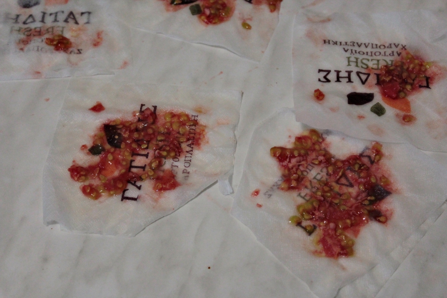 You could take a tomato and use it to trace the contours of many different histories, as they relate to each other but also as individual phenomena. I’m questioning relationships between power structures, social constructs, abuse of power, with a metaphor of territoriality. A woman’s body, for example, functions as another kind of territory in the way it can be stolen, occupied, violated, colonized. It was happening in Yugoslavia. Women were violated in a gesture of pure disdain. Violence was done to women and girls in order to annihilate their bodies and strip them of their identities. This line of thought has added to the corporeal, feminist element of the project for me. Seeds, and their care, has always been so-called women’s work – at least in the Balkans. Women were in charge of drying and choosing seeds. It was women who knew which ones were worth replanting and which were more likely to bear fruit. The connection is natural enough as a woman is herself a seed, a transformative being, preparing, nourishing, and so this connection has been largely internalized.