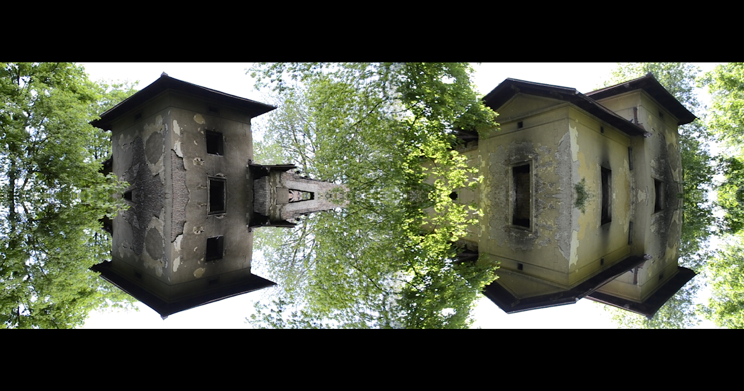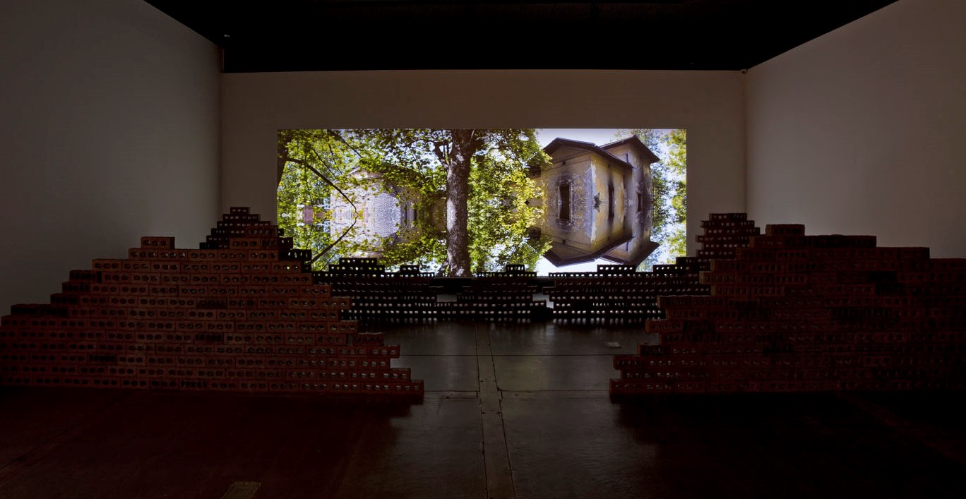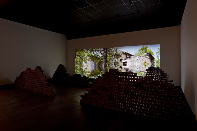 Twenty years after displacement, the artist returns to her birth city of Sarajevo to find and document her family’s home in ruin. Four perspectives of the house are stitched together and mirrored to collapse the structure and emphasize the anthropomorphic features of the architecture; how its porous and crumbling frame suggests a kind of living being. The panoramic, enveloping, uncanny landscape extends to the brick barricade stacked on the gallery floor, which hide layered voices of conversations sourced from the artist and her father rummaging for memory, and from unexpected visitors who occupy the structure in the present day. The installation inserts the ghostly presence of the placeless into a landscape from which notions of home and the construct of identity have all but evaporated, providing only echoes of the past, present and ambiguous future.