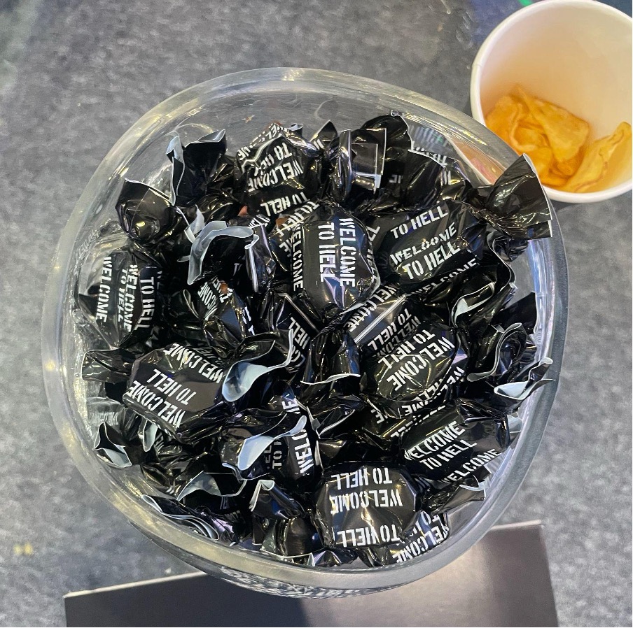 Bofors Test Center, offering vodka and candies with the text Welcome to Hell, DSEI 2023. Credit: N.E.