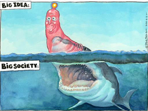 But we now learn that the government has settled on a rather interventionist approach to all the lovely knowledge we are tasked to produce. ‘Two-minds’ Willetts has decided that the Arts & Humanities Research Council will be allowed to distribute £100 million in research monies each year, but only on condition that it accepts a ‘revision’ of the Haldane Principle (“that decisions on individual research proposals are best taken by researchers themselves through peer review”) and so spends a ‘significant’ amount of that money on research into the Big Society. Under the new ‘understanding’, the government continues to ‘value’ and ‘recognise’ the importance of academic independence, but wishes only to propose the merest of commonsensical adjustments: