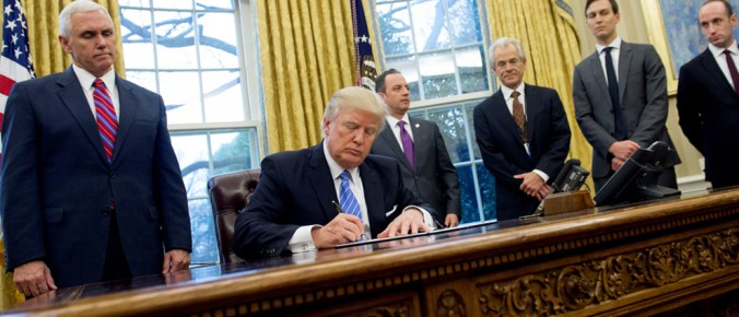 US President Donald Trump signs an executive order in the Oval Office of the White House in Washington, DC, January 23, 2017.